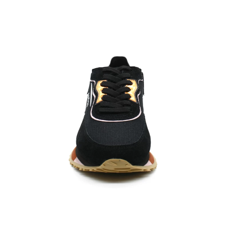 Empiècement de bandes en cuir suède et miroir orange sur le coté et au talon.